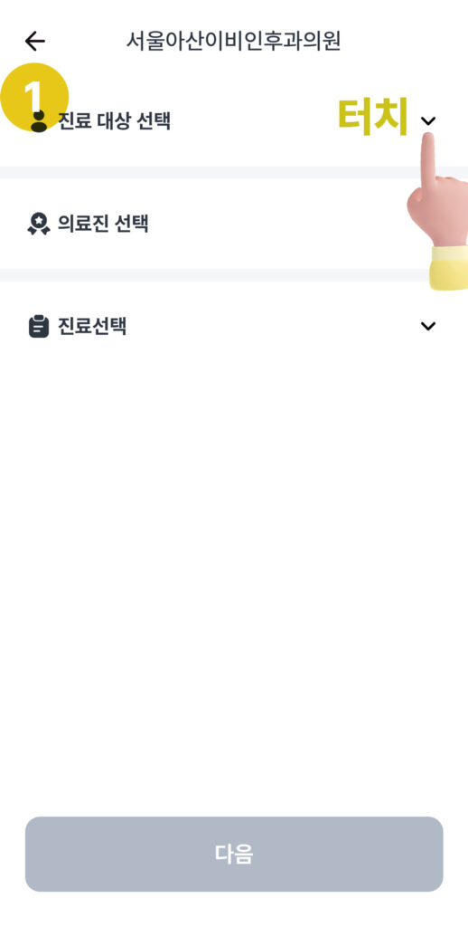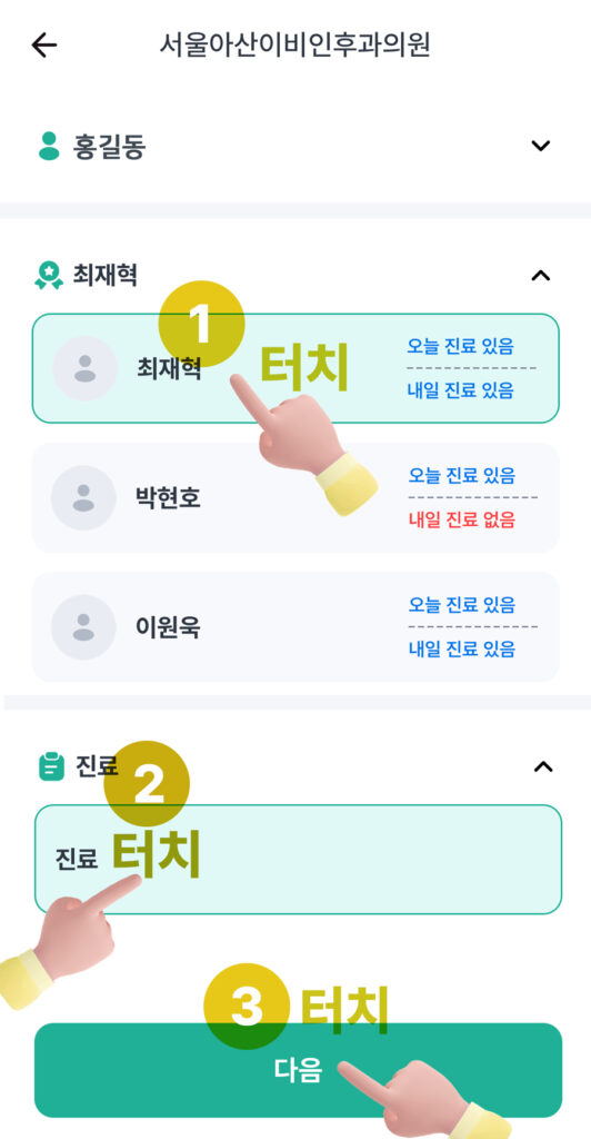① 원장님을 선택 한 상태에서 하단의 ②진료 버튼 선택 후 ③다음을 누릅니다.
