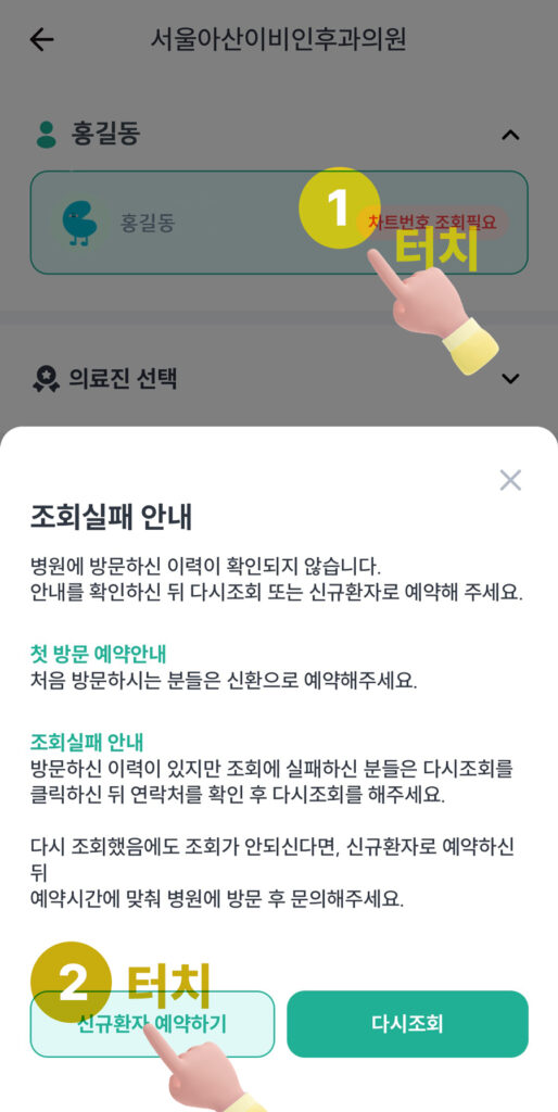 ① 환자명을 선택 한 상태에서 하단의 ②신규환자 예약하기 버튼을 누릅니다.