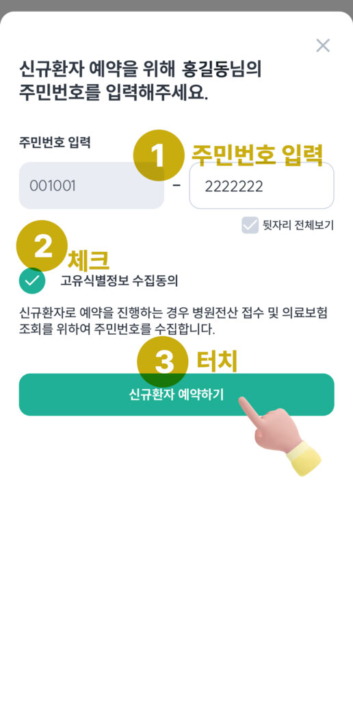 ① 주민번호 입력 후  ②체크 버튼을 누른 뒤 ③ 신규환자 예약하기 버튼을 누릅니다.